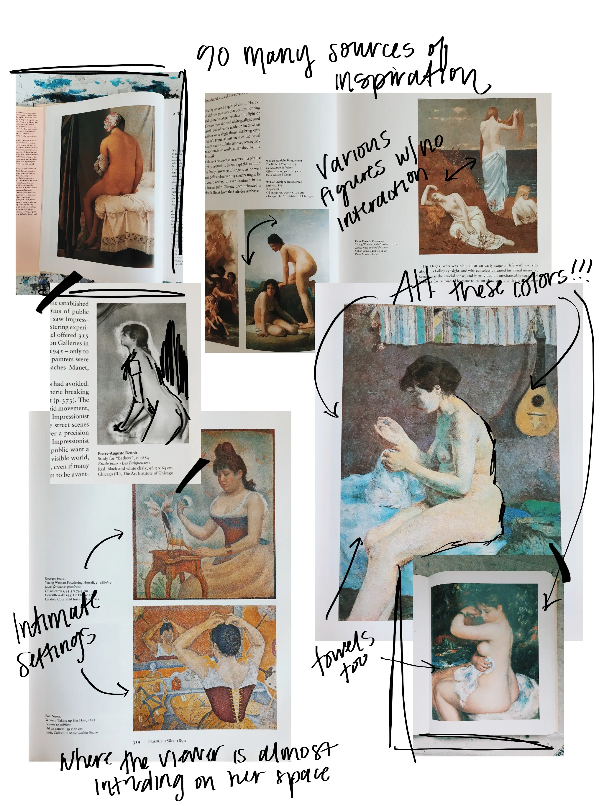 when learning art history; starting with early Titian to Cezanne, the obsession and depiction of nude bathers can be seen through the centuries. I think what interested me most was the many meanings of each painting--- yes, some signifying cleanliness-- but others also represent fertility, death, healing or even birth. In certain timeframes, it was the newest way to showcase the natural beauty of the female form. Others even sexualized the scenes. By the early 1900's, the bather became yet again one of the most common motifs in modern contemporary art. (i'll stop rambling here because i'm a serious art history nerd-but look some up!)